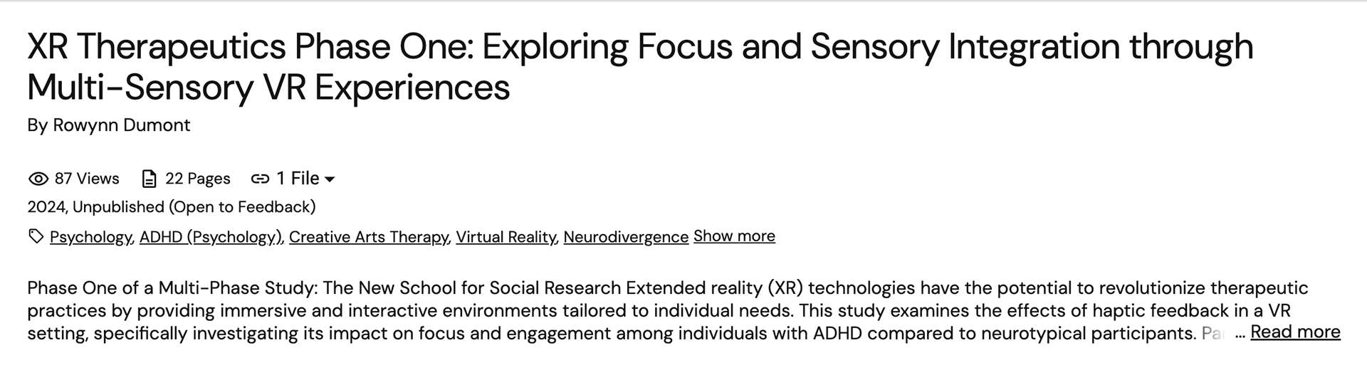 XR Therapeutics Phase One: Exploring Focus and Sensory Integration through Multi-Sensory VR Experiences