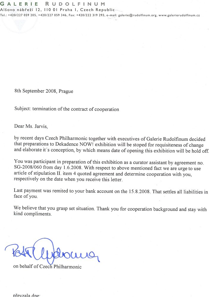 Letter from Galerie Rudolfinum / Czech Philharmonic terminating the contract of cooperation related to Decadence NOW!, dated 8 September 2008.