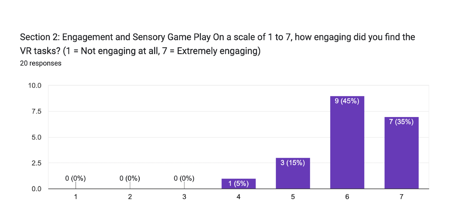 Despite usability and focus differences, participants rated the VR task as engaging across both conditions, with an average engagement score of 6.1 out of 7. This suggests that immersion alone does not reliably indicate accessibility or cognitive comfort
