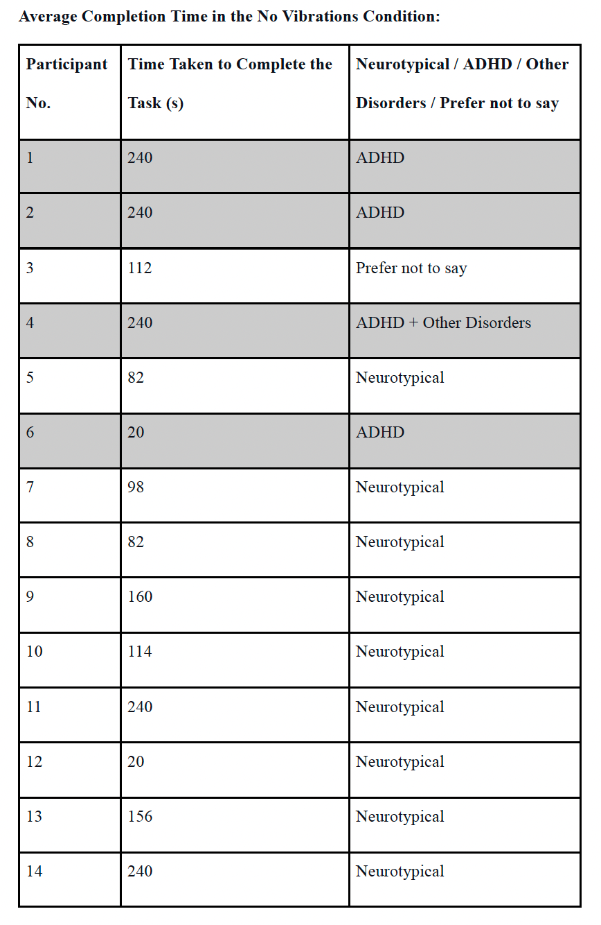 Across all participants, focus and ease of use were reported more frequently in the no-vibration condition, while engagement remained high in both conditions (mean engagement score = 6.1 / 7). Completion-time data showed longer average task durations and more timeouts when vibration was enabled, particularly among participants with ADHD.