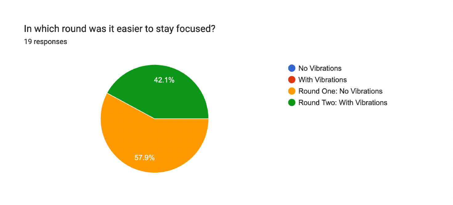 Survey results show that 57.9% of participants reported better focus without vibration, compared to 42.1% with vibration, and 63.2% reported greater ease of use without vibration (vs. 36.8% with vibration). These results indicate that vibration introduced friction rather than improving usability for many participants.